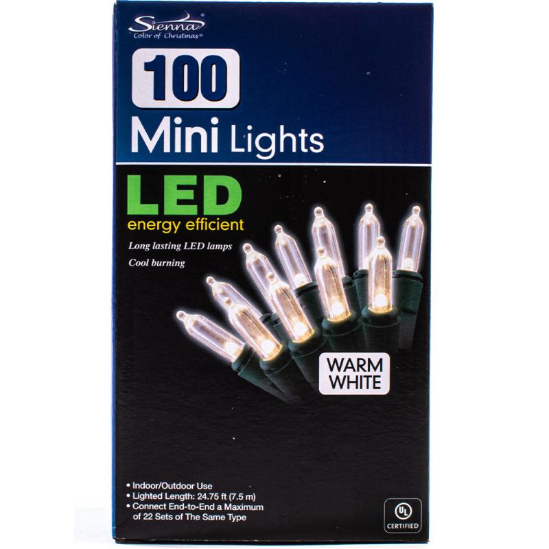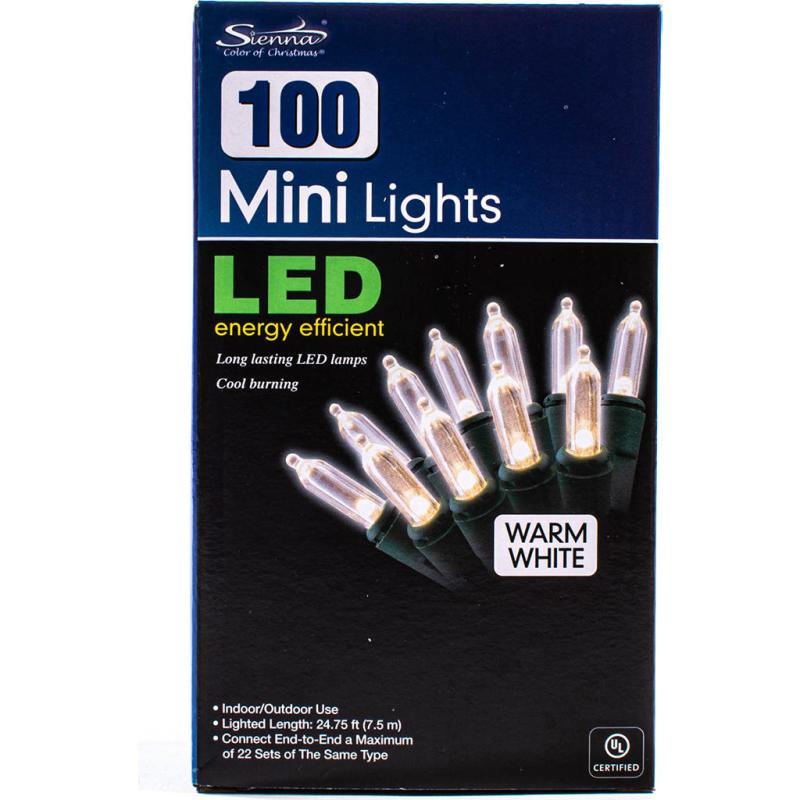 | Use these energy efficient LED mini lights indoor or outdoors as part of your holiday decorating. UL listed. 100 light LED M5-incandescent. 27 ft L with green wire and 3" bulb spacing. |