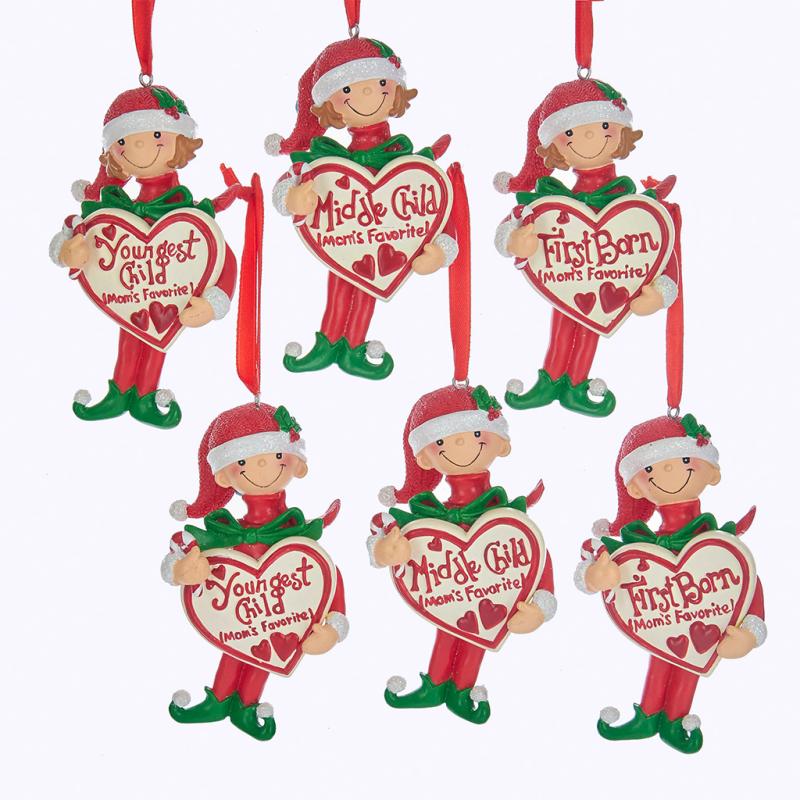 | Celebrate your place in the family with this assortment of Mom's Favorite ornaments from Kurt Adler. Each ornament features a girl or boy holding a heart-shaped sign that reads "Youngest Child," "Middle Child," or "First Born." |