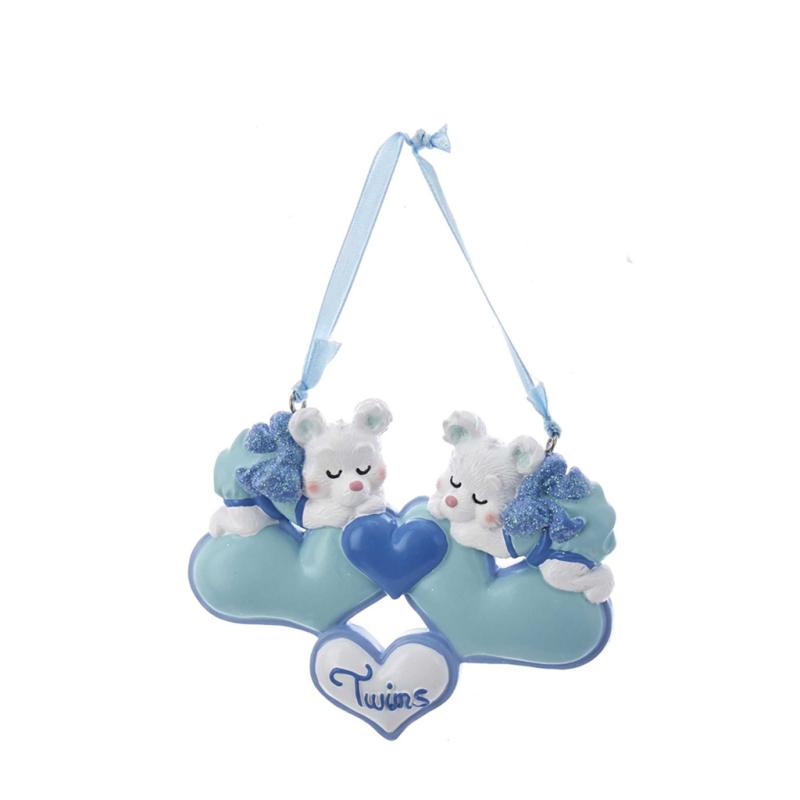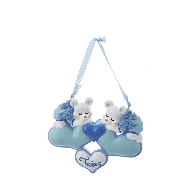 | Celebrate your favorite twins with this twin boys bears with hearts ornament from Kurt Adler! This ornament features two white twin-boys bears sleeping on top of two light blue hearts. The bottom white heart has the word "Twins" written in blue lettering. |
