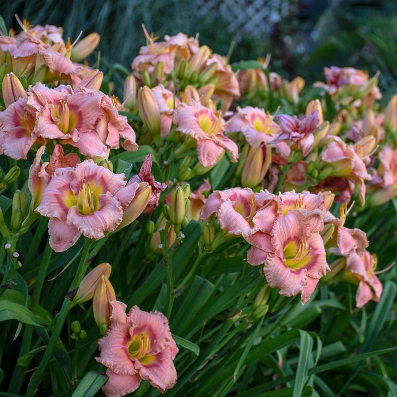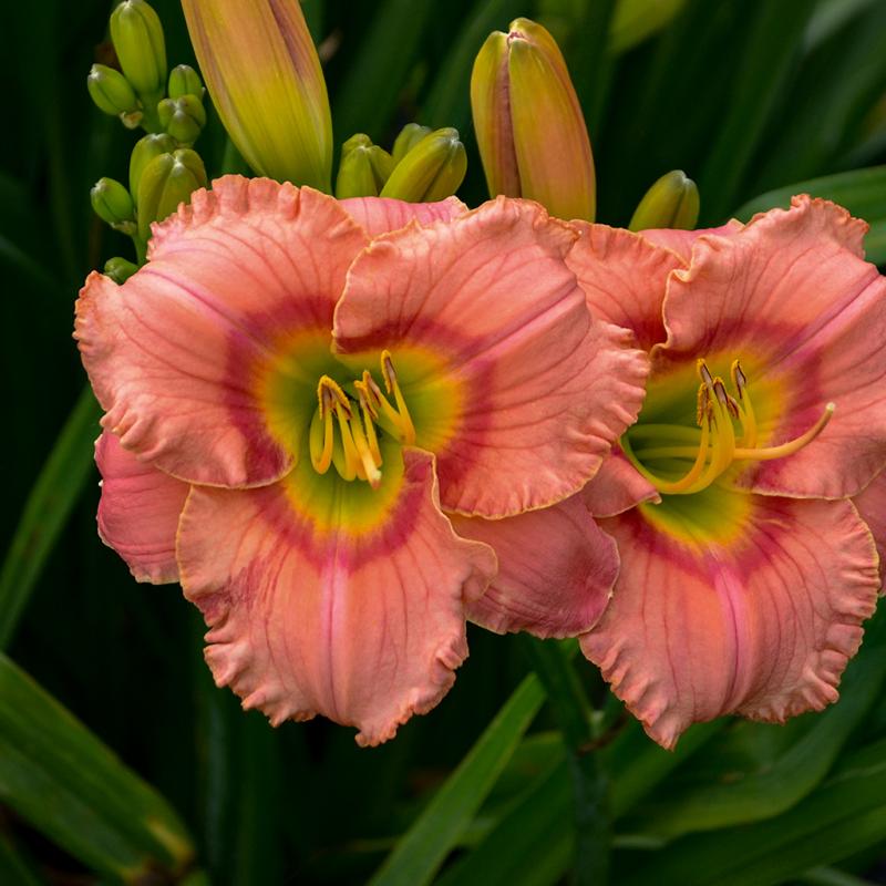 4¼", medium pink flowers with a triangular red eye and a green throat Blossoms are round in form and heavily ruffled The flower color is sunfast Strong, well-branched, and budded scapes Notably fragrant Healthy, deep green foliage |