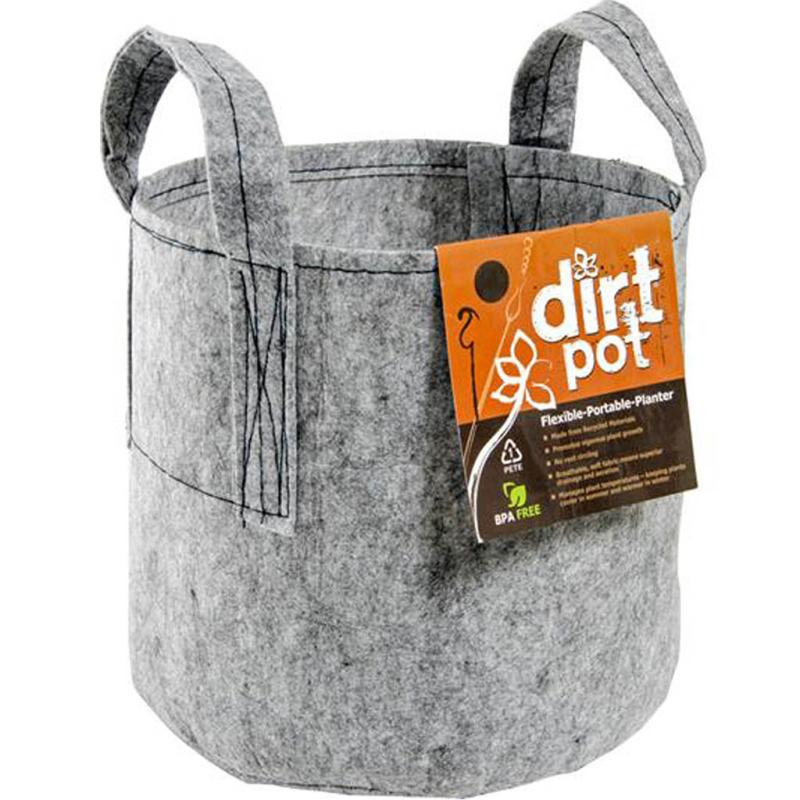 | Hydrofarm's grey Dirt Pots offer value and versatility for outdoor use or as part of hydroponic growing systems. Featuring porous breathable fabric that is made from 100% recycled water bottles, these planters allow your plants to thrive by promoting exceptional root health and vigorous plant growth. The soft-sided construction allows the planter to conform to your terrain, making it the perfect choice for all growing areas. Grey Dirt Pots are stronger than similar products, with reinforced seams and stitching. They are non-degradable, so they will hold up for multiple growing seasons. |