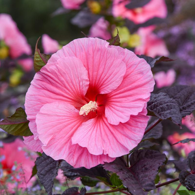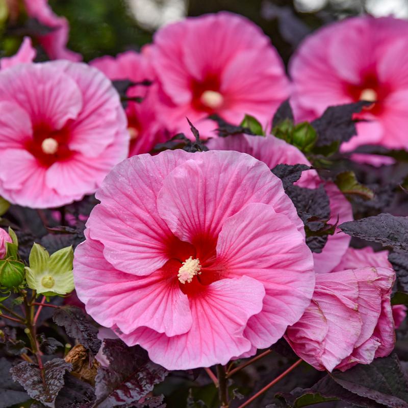 | One of our most hotly anticipated additions to the SUMMERIFIC® lineup in recent years! At only 3-3½' tall, this is our most compact Hibiscus. 7-8" bubblegum pink flowers have overlapping petals and darker pink veining for a dramatic 3D effect. Jet black foliage is the darkest we've seen on a Hibiscus and contrasts nicely with the green flower calyxes, red veining, and petioles. Compared to 'Evening Rose,' this has darker foliage, a more compact habit, and brighter pink flowers. The best color and performance will be in full sun. These North American native plants bring massive, tropical-looking flowers to Zone 4. Although they emerge later than most perennials in spring, these fast-growing plants can add an inch of new growth daily. They are excellent at brightening up end-of-season gardens. |