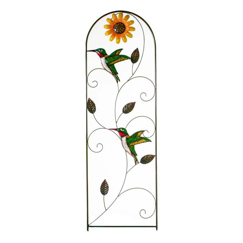 Sturdy powder-coated steel trellis with hand-painted, brightly-colored hummingbird, flower, and leaf accents.