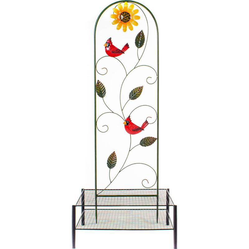 Sturdy powder-coated steel trellis with hand-painted, brightly-colored cardinal, flower, and leaf accents.