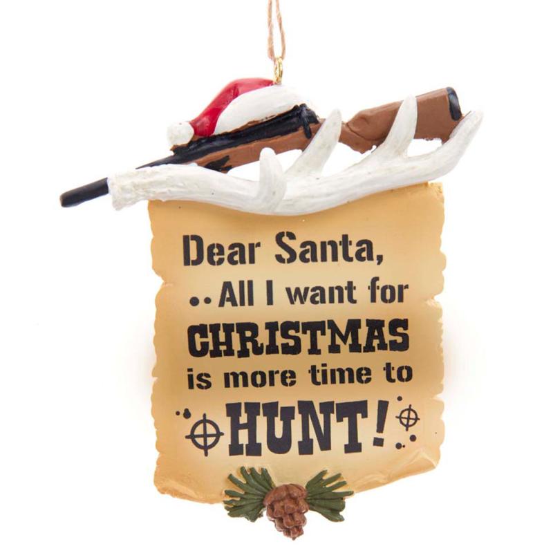 | This hunting letter to Santa ornament is a fun and festive addition to your holiday décor or Christmas tree. It features a red and white Santa hat, antler, rifle, and a pinecone. |