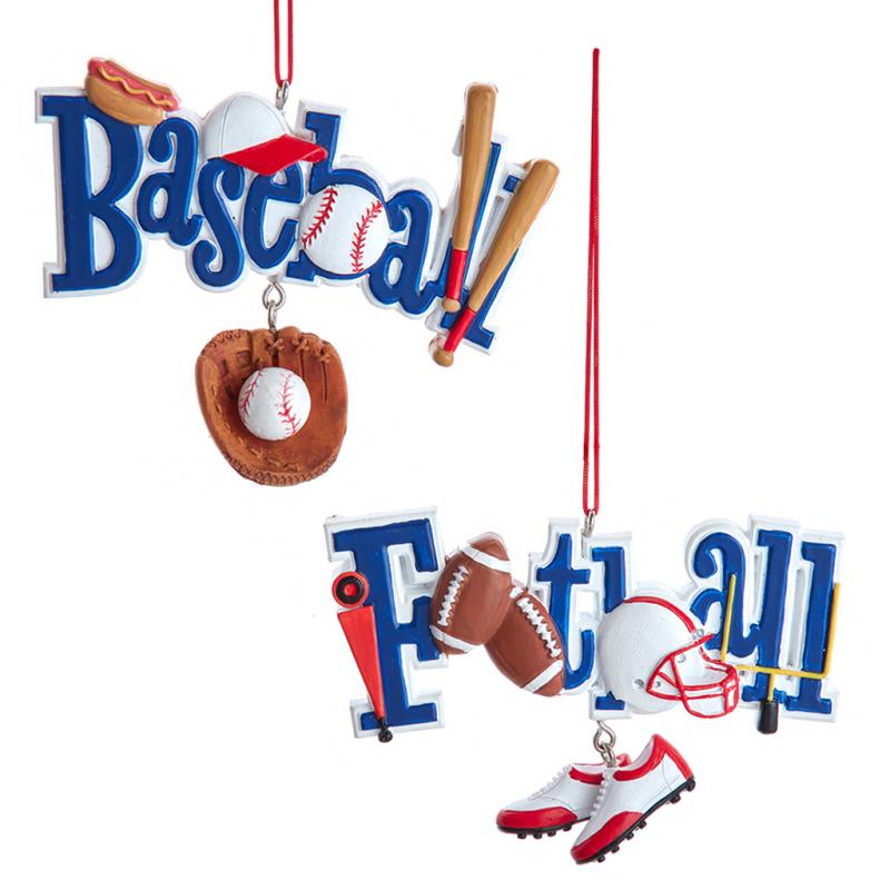 | Kurt Adler's "Baseball" and "Football" ornaments are a fun and festive addition to any holiday décor or Christmas tree. Each ornament features sports equipment with a glove or shoes dangle. |