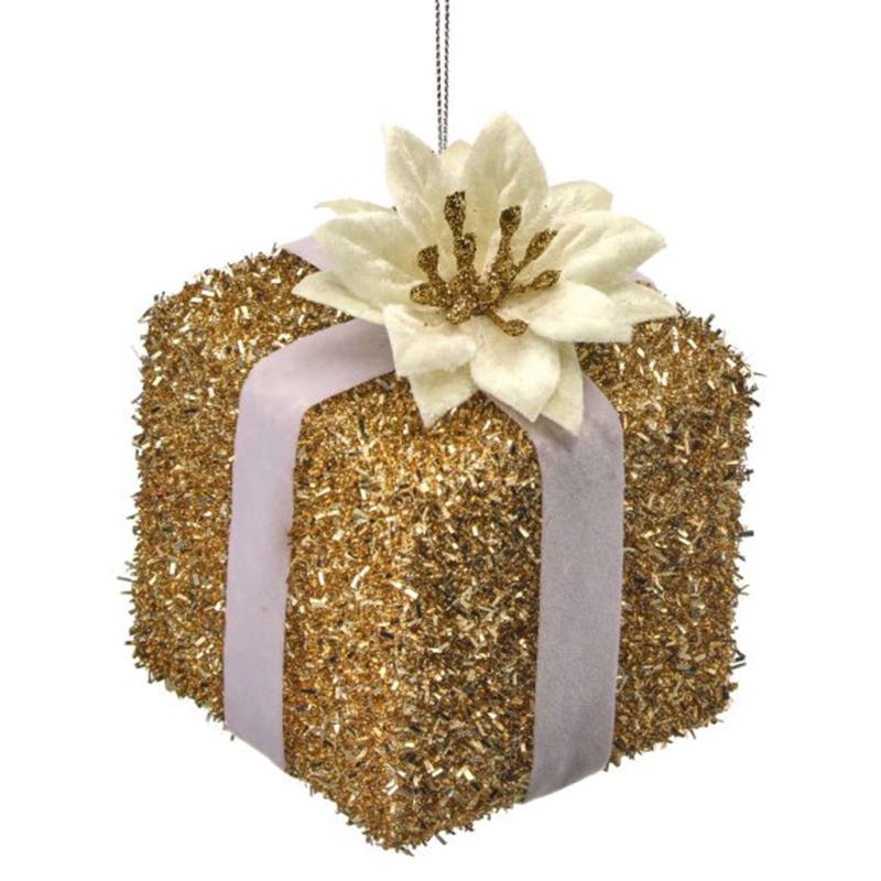 Gold / Champagne Theme Ornaments Glitter Pointsettia Gift Box Ornament
