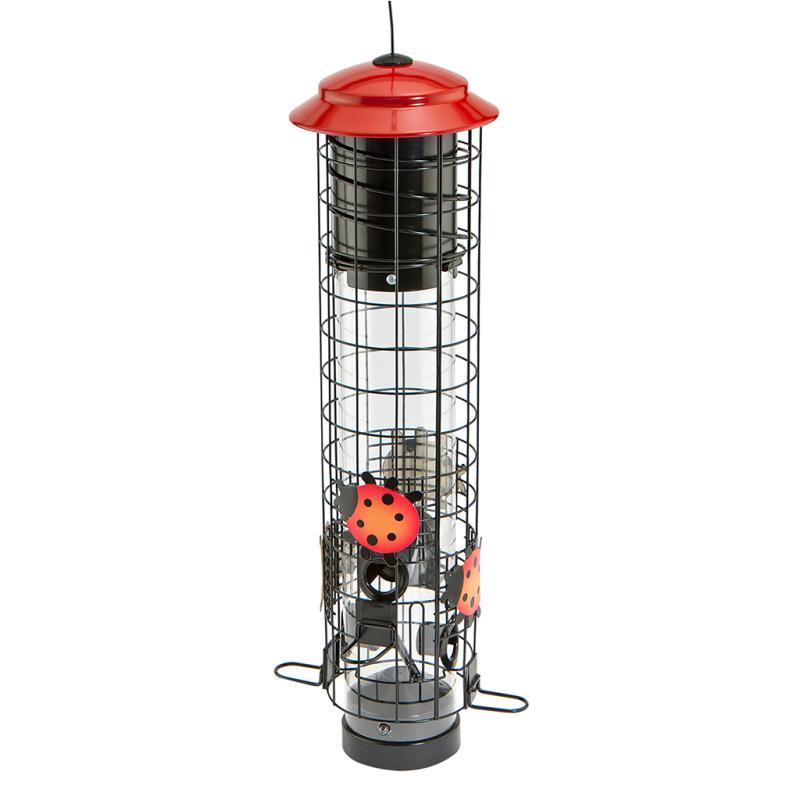 | The Audubon ladybug squirrel resistant tube feeder encases a tube feeder in a spring loaded cage thus foiling squirrels from accessing seed. Sturdy powder coated steel cage has a decorative ladybug design and 4 perches. Squirrels land on perches and their weight causes the spring loaded cage to slide down, closing access to seed. Has a twist lock lid and easy clean quick release bottom. 4 perches. No assembly required. |