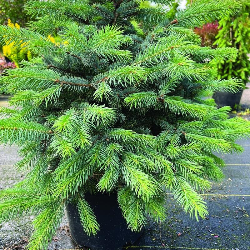 | A seed strain selection from West Montrose farms in Canada, Baby Blue® spruce has remarkable color reliability. The vibrant blue needles intensify with age, growing evenly around the branches, creating a full appearance. While this tree grows slowly, it has good vigor with a uniform and compact habit that requires virtually no shearing to maintain. It is an excellent blue variety that is more slender than the common Colorado Blue spruce and grows well in open areas. |