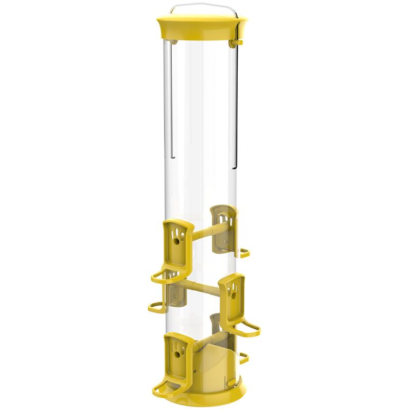 | Defend your bird seed from undesirable critters with multiple squirrel-stopping features on this Squirrel Shield cage feeder! The weight-sensitive cage collapses under the weight of a squirrel to block the seed ports should they try to jump onto any part of the feeder from below. A quick locking roof secures the top of feeder with a simple half-turn to ensure that squirrels are not able to reach in and gorge themselves on seed. The push-toggle roof provides quick access for easy refilling while hanging and doubles as a secondary defense to keep squirrels out! This feeder's innovative design allows the base to be removed by simply depressing two quick release tabs for a more thorough cleaning without the use of tools. Durable powder-coated metal roof and cage and a UV-stabilized tube make for a superior quality feeder that you and the birds will enjoy for years to come! |