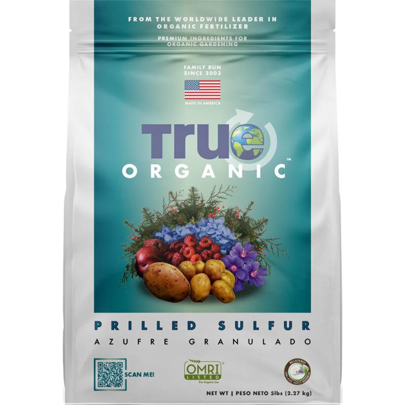 | True Organic Sulfur contains elemental Sulfur that is OMRI listed for organic gardening and is beneficial for overall growth, flowering and fruiting; producing superior flowers, vegetables, herbs and foliage. Promotes dark green growth. Good for hydrangeas and blueberries. Turns hydrangeas from pink to blue. |
