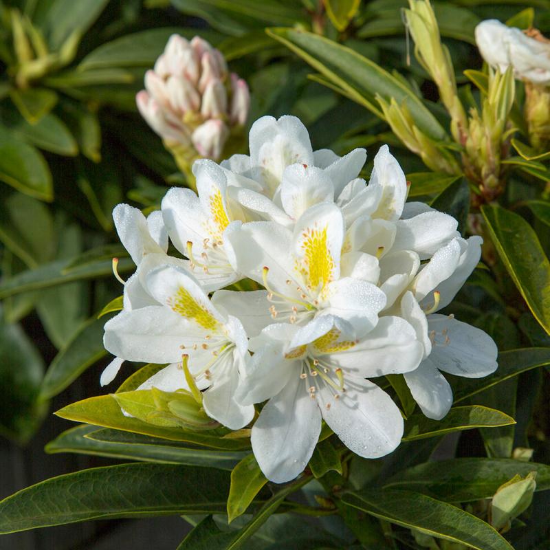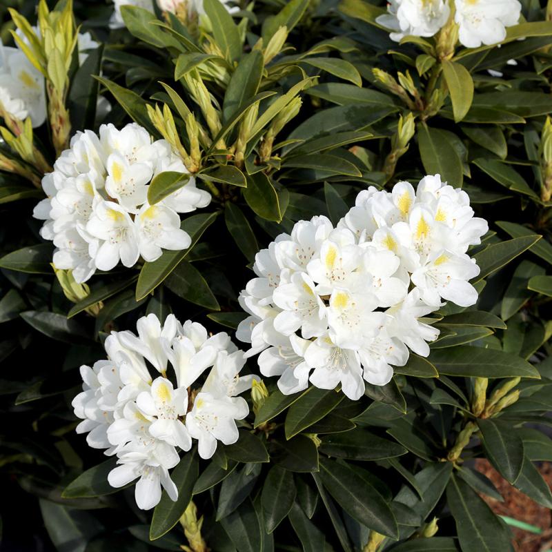 | A late to mid-season bloomer with large, rounded trusses, each holding a dozen or more clear white bell-shaped flowers with yellow dorsal blotches. The compact, dense form is wider than tall, with an excellent even growth habit. Exhibits good sun tolerance. Outstanding for use as an informal hedge or foundation plant. It is an evergreen shrub. |