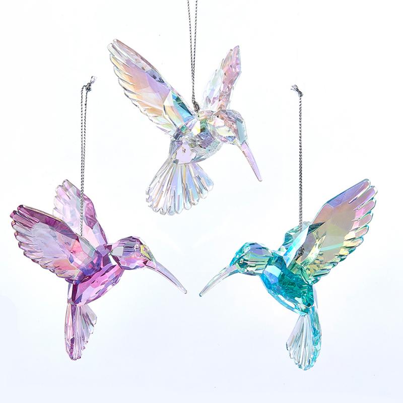| These iridescent hummingbird ornaments from Kurt Adler are a unique addition to your holiday décor or Christmas tree! This set of three ornaments has a beautiful iridescent finish and comes in blue, purple, and clear. |