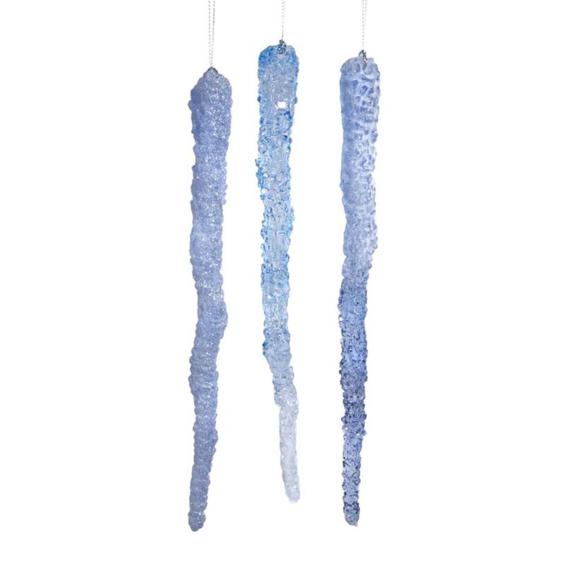 | These three assorted blue and clear icicle ornaments, made of plastic and mica by Kurt Adler, are a beautiful, classic way to add to your holiday décor. Each icicle ornament features a wonderfully realistic-shaped icicle coated in glitter for a shimmering effect. |