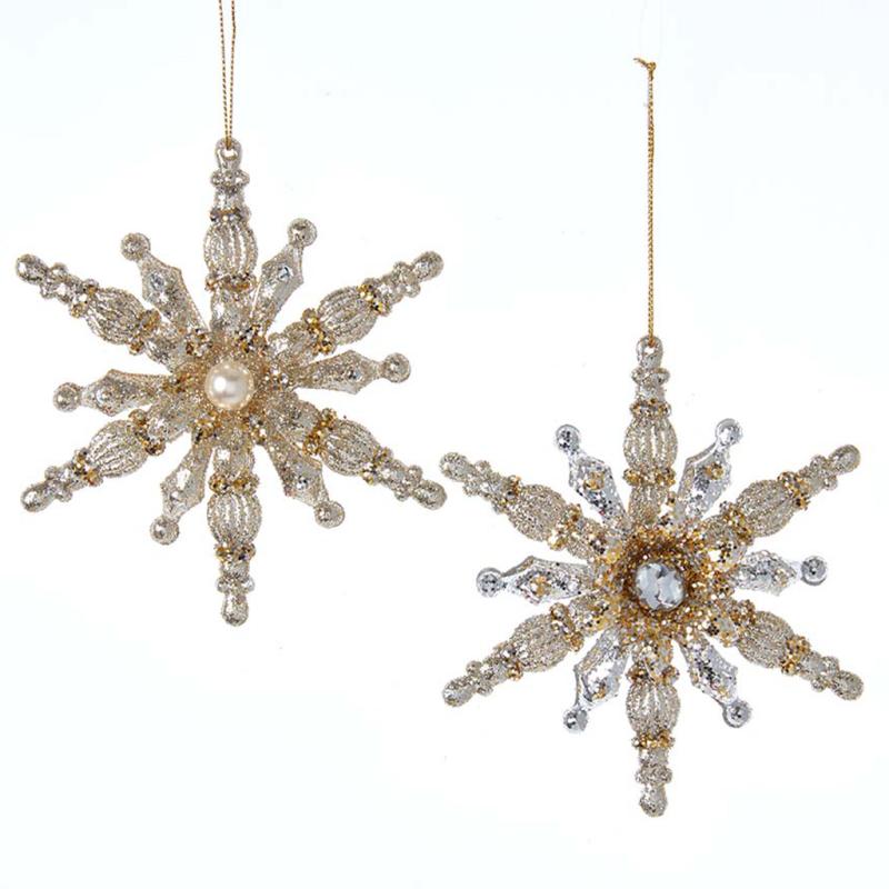 | Kurt Adler's light gold and silver snowflake ornaments are an elegant addition to any holiday display or Christmas tree. This assortment features two light gold and silver glittered snowflakes. Each snowflake is uniquely shaped with either a clear gemstone center or a white pearl center. |