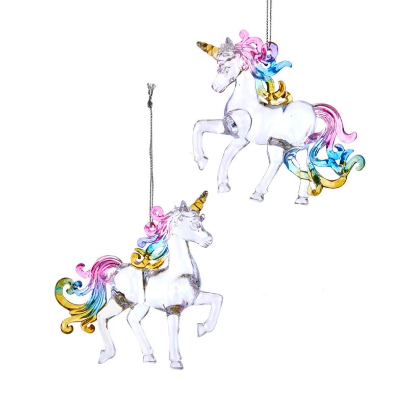 | Kurt Adler's clear unicorn ornaments are a fun addition to any holiday décor or Christmas tree. This assortment features two translucent unicorns in various poses. Each unicorn has a translucent pastel-colored mane and tail and a golden horn. |