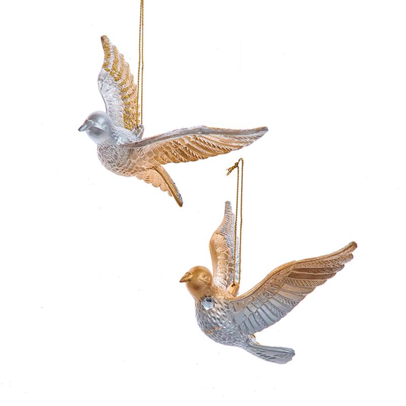| Kurt Adler's ombré dove ornaments are a festive addition to any holiday décor or Christmas tree. This assortment features a dove with a silver head and a dove with a gold head. Each dove has clear gemstone accents. |