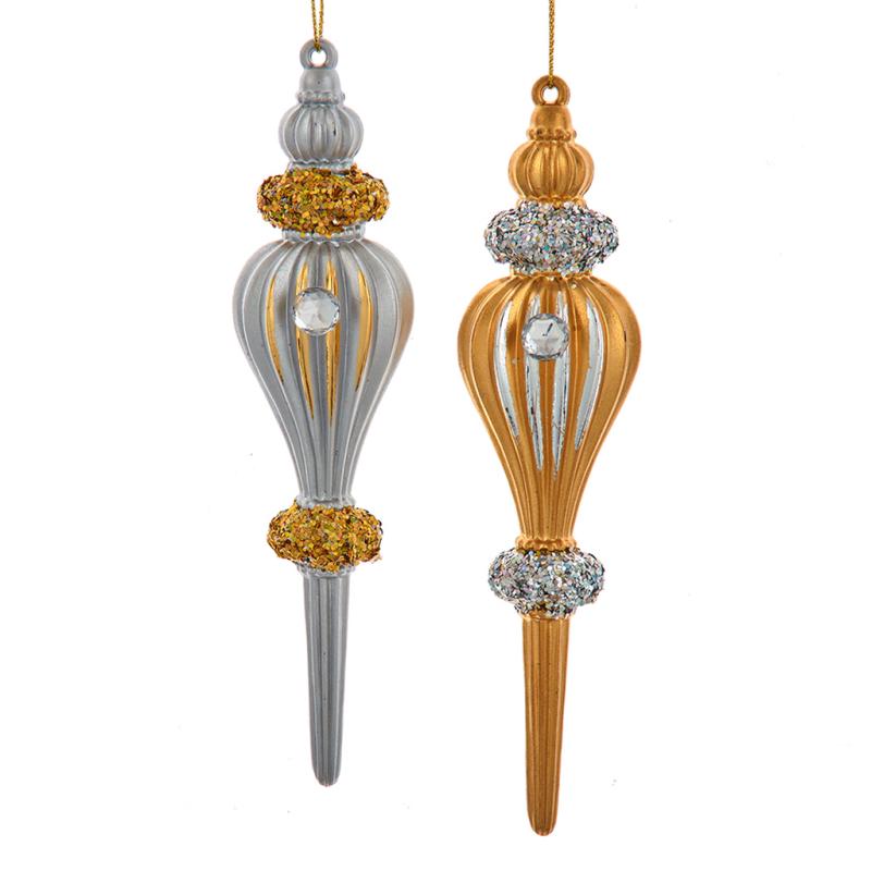 | Kurt Adler's silver and gold ombré finial ornaments are a festive addition to any holiday décor or Christmas tree. This assortment features a gold finial with silver glittered accents and a clear gemstone center and a silver finial with gold glittered accents and a clear gemstone center. |