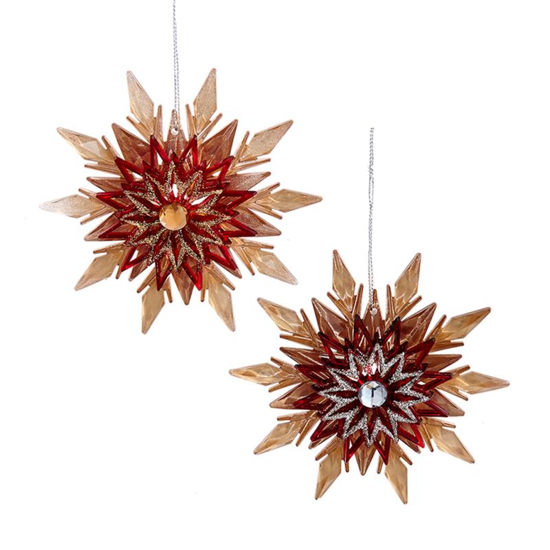 | These cranberry and gold snowflake ornaments are a festive addition to any holiday décor or Christmas tree. This assortment features two uniquely shaped gold snowflakes with a cranberry, silver glittered, and a clear gemstone center. |