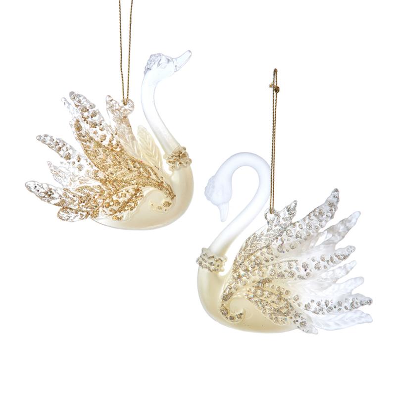 | Kurt Adler's ivory and gold swan ornaments are a festive addition to any holiday décor or Christmas tree. This assortment features two swan ornaments, each decorated with glitter and wearing a glittered collar. |