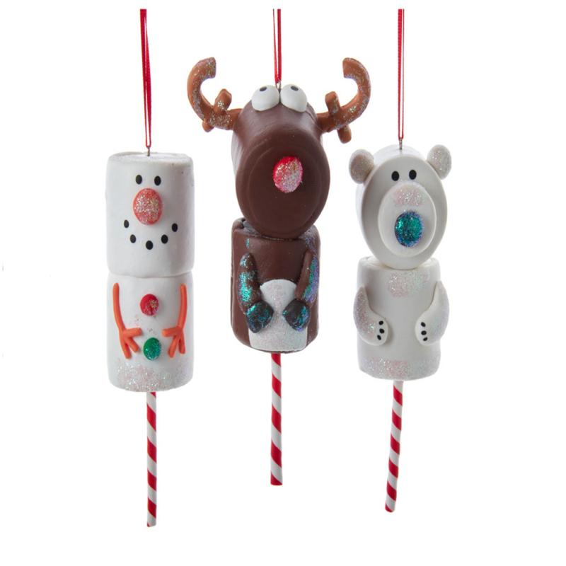 | These marshmallow ornaments from Kurt Adler are a fun and festive addition to any holiday décor or Christmas tree. This assortment includes a snowman marshmallow, a reindeer marshmallow, and a polar bear marshmallow. Each is decorated with glitter for a sugared effect and has red and white popsicle sticks. |