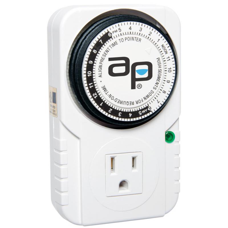 | Using an analog timer to automate your lighting adds convenience and encourages productive growth with consistent hours of light. Timers are also essential for all hydroponic system applications. 15 Minute On/Off. 15 Amp / 1725 Watt. Great for lighting, pumps, and more. Includes convenient clam shell packaging. UL Listed. |
