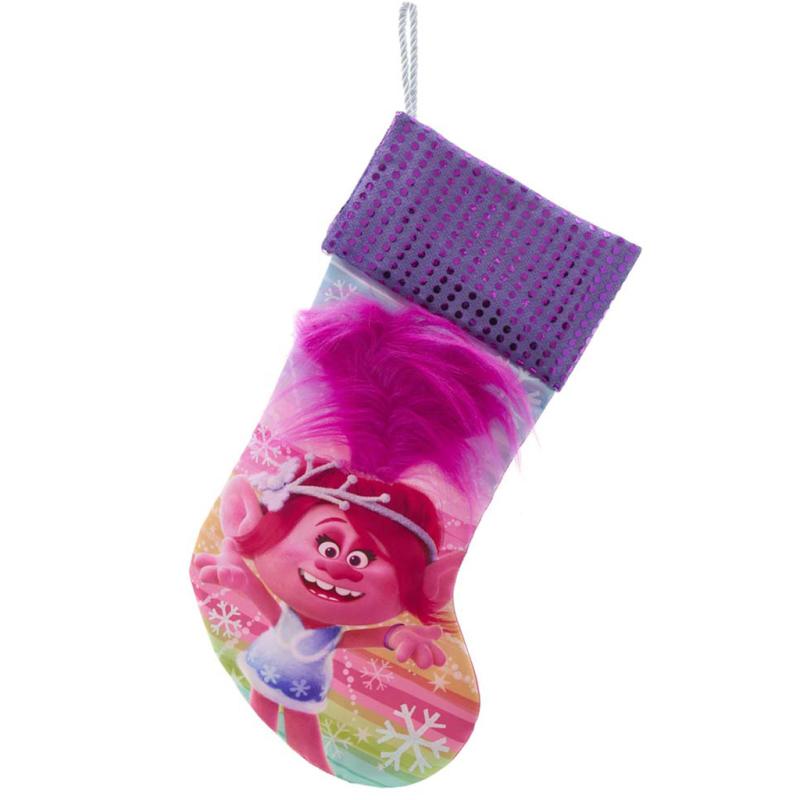 | Don't be alone this holiday; celebrate with the Trolls, Poppy© Printed Stocking from Kurt Adler. When it comes to hanging your stockings with care, it doesn't get much cuter than our Trolls Poppy Christmas Stocking! The stocking cuff is purple, and behind Poppy, there is a rainbow of colors. |