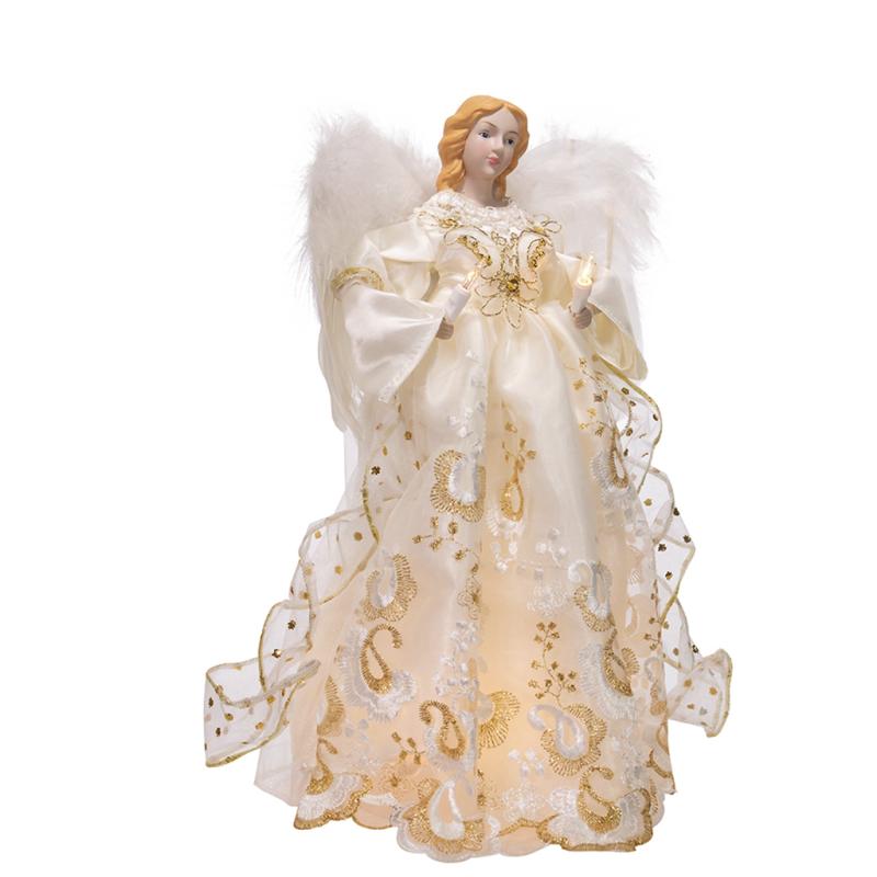 Description: This Kurt Adler gold angel treetop is a beautifully classic way to decorate your Christmas tree. Dressed in a long white gown with white and gold teardrop detailing in the skirt and sheer white ribbons, this blonde angel has large white feathered wings and is holding two light-up candles in her hands. She is a lovely finishing touch to any Christmas tree!