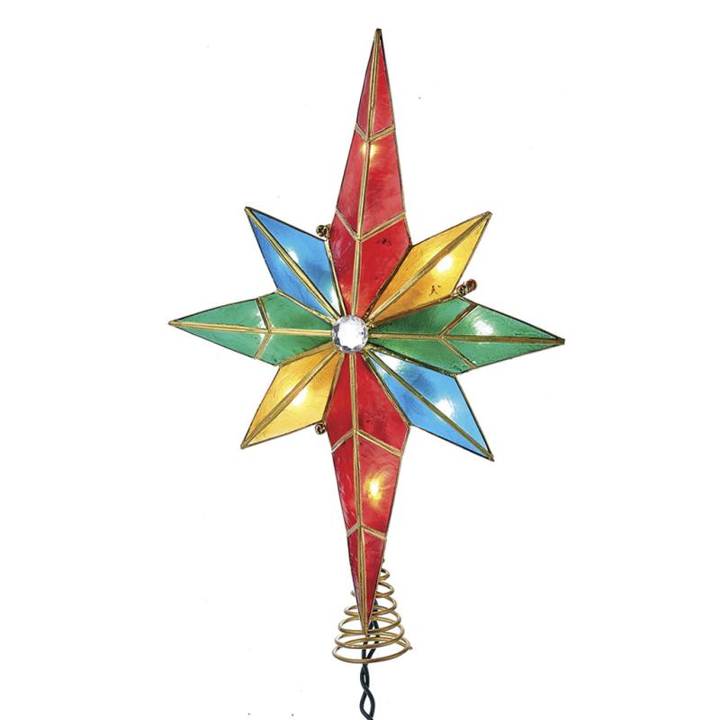 | This Kurt Adler multicolored capiz Bethlehem star treetop with gem center is a beautiful, classic way to add to the lighting of your Christmas tree. This 8-pointed star with bright multicolored design is gridded in gold wire and has a shining rhinestone gem at its center. | |