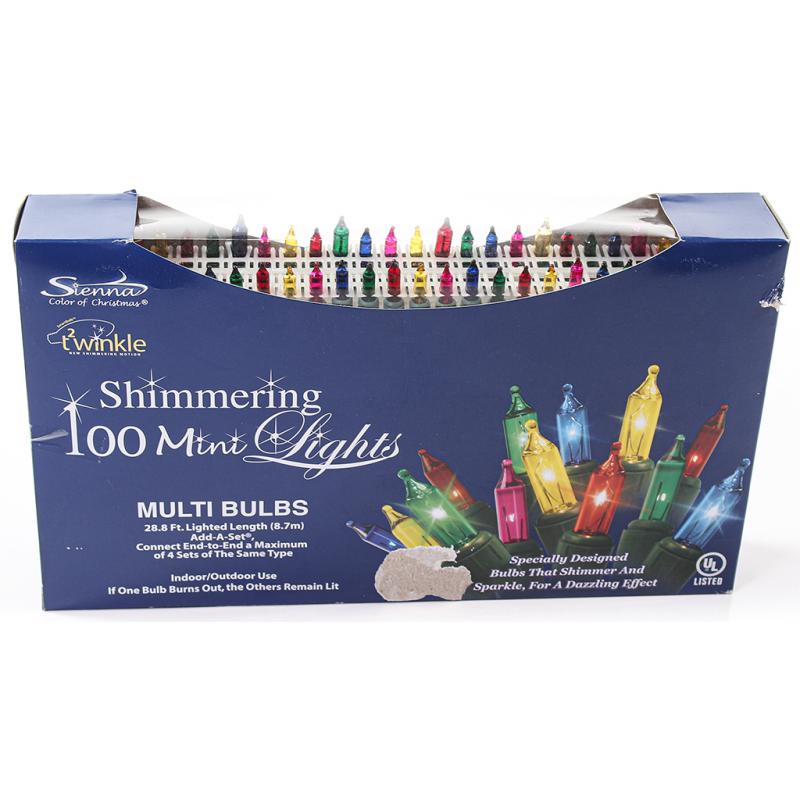 | Sienna has patented shimmering bulbs that add sparkle to holiday decorating. This set of 100 multi-color clear shimmering incandescent mini lights is spaced 4" apart and has a green wire with a total length of 30.8". |