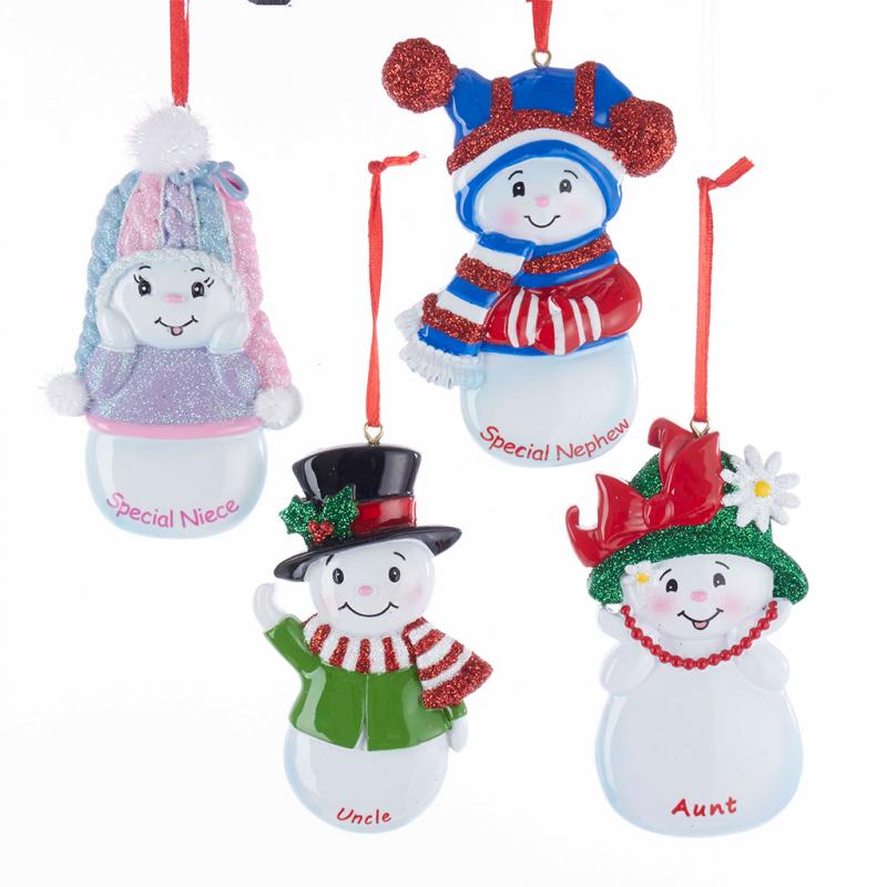 These Snowfamily "Special Niece, Special Nephew, Uncle, and Anut ornament for personalization from Kurt Adler is a heart-warming addition to your holiday collection.