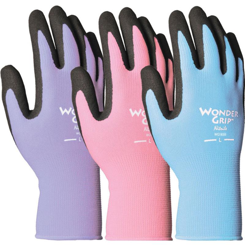 Description: Wonder Grip Nearly Naked garden gloves are sheer and lightweight. Proprietary coating formula breathes - keeping hands cool while maintaining a superior grip even when wet. 18-gauge nylon liner and snug fit shaping adds to the unsurpassed comfort and dexterity of these gloves. Comes in three assorted pastel colors - lavender, pink and blue.