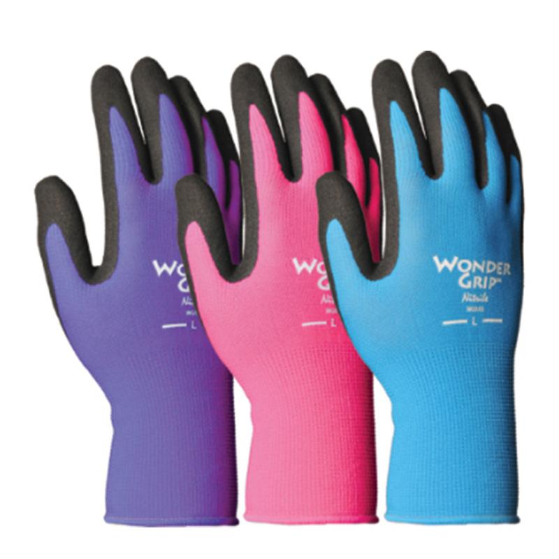 Description: Wonder Grip Nicely Nimble garden gloves feature a vivid 15-gauge nylon knit liner with the Wonder Grip proprietary micro-porous nitrile coating on the palm and fingertips allowing superior grip. Comes in three assorted colors - purple, pink and blue.