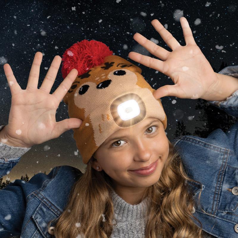 | It has an ultra-bright LED beam that is constant white or rotating multicolor. It has an easy-on/off push-button and a removable light pod for easy charging and washing. Great for safety! One size fits most kids age 6+. Here are six styles: Santa, penguin, elf, gingerbread, reindeer, and snowman. |