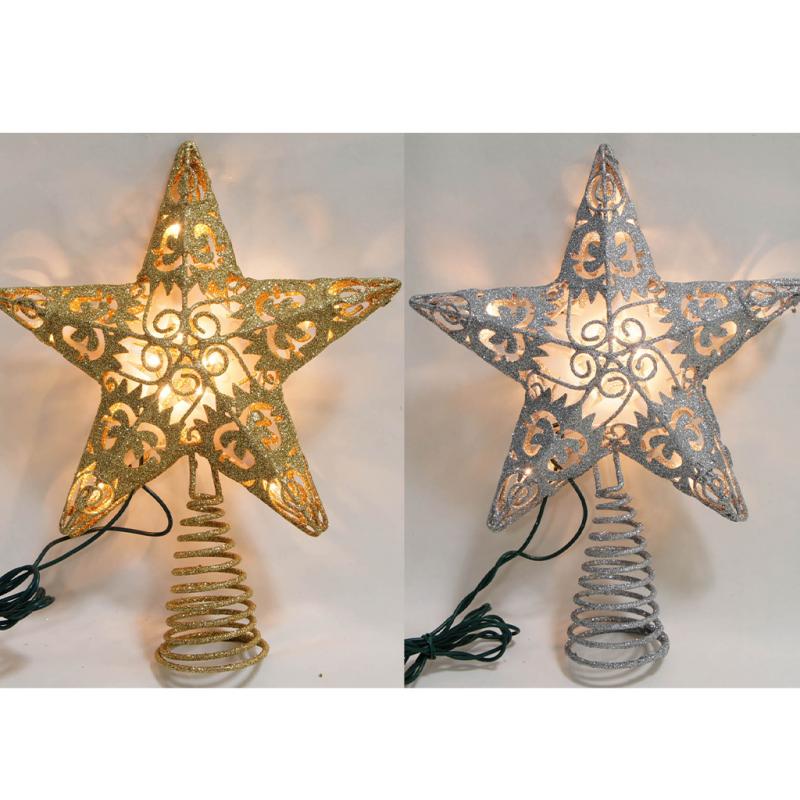 5 point glitter star lighted tree toppers gold and silver star. Silver & gold assorted. 12 each style. Indoor use only. 24" lead wire.
